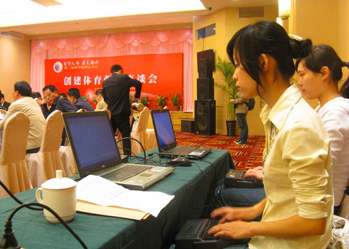 11月8日,世温会“高峰论坛”在温州市人民大会堂举行。会议开始前,我院潘拉微老师和许捷等同学已经一字排开早早地等候在现场。他们每人掌控着一台手提电脑,膝盖上放着一个盒子大小的速录机。当会议开始后,他们灵巧的手指在键盘间上下翻飞,犹如弹钢琴一样轻松自如,把会议上发言者的只言片语都记录在案,把发言的声音“翻译”成了文字。这个场景十分吸引“眼球”,许多在场的记者来不及记录,纷纷探过脑袋“瞄”几眼。11月9日,温职院速录队又出现在“创建体育强市座谈会”上。会上,许多领导发言语速极快,而会后又要求把每位发言者提出的温州体育发展的建议都一一记录下来,以供以后科学决策备用。速录人员再次展现出惊人的速录技巧,得到会议组织者一致好评。