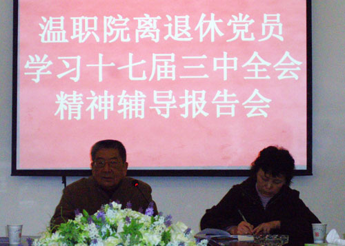 为了深入学习贯彻十七届三中全会精神,12月2日上午,我院离退休党总支在成教学院举行了温职院离退休党员学习十七届三中全会精神辅导报告会,近40位老党员聆听了报告会。会议由离退休党总支书记钱芳主持,我院原组建单位之一——温州商校校长、现退休第一党支部书记叶正中作辅导报告。