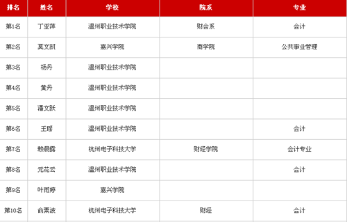 截止19日,在浙江赛区比赛中,前30的排名中,我院财会系学生占有17个席位,其中会计专业的丁亚萍名列第一,杨丹、黄丹、潘文跃分别位居第三、四、五。
