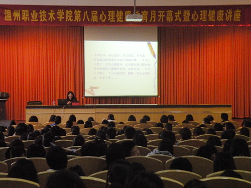 为加强我院大学生心理健康教育,推进优良学风建设,11月13日下午,温州职业技术第八届心理健康教育月开幕式——心理健康讲座在信息楼报告厅顺利举行,学生处副处长苏跃飞作了重要讲话,强调了心理健康教育的重要性,并对心理委员的工作提出了要求和希望。随后,温州医学院心理学教授林巧爱为同学们作了题为“大学生恋爱与性心理健康”的心理健康讲座。