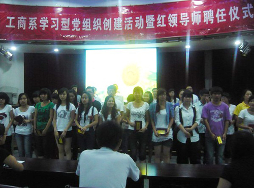 据了解,工商系针对顶岗实习背景下的三年级大学生党员培养教育问题,积极探索学生党建与非公企业党建新的接合点。我们聘请非公企业党务工作者为“红领导师”, 学生党建工作和非公企业党建工作进行对接,让学生党员发展程序中引入非公企业党建,延伸党建阵地。