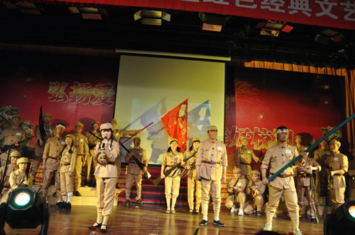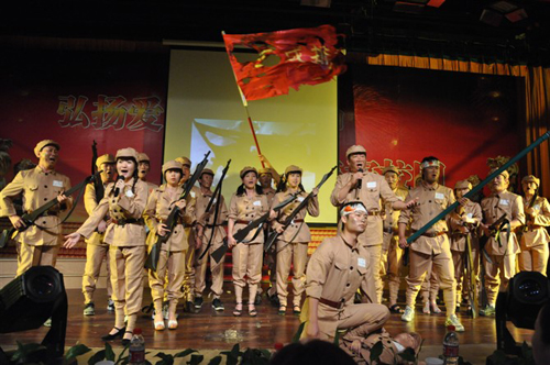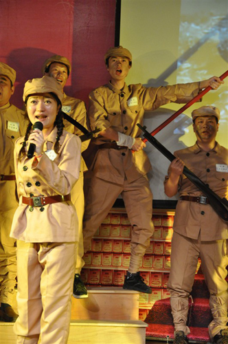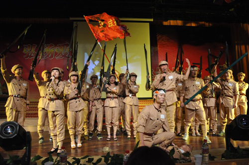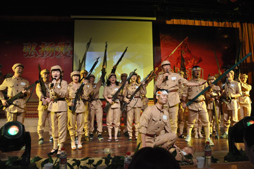 据悉,轻工系为了迎接“庆七一建党八十九年纪念大会暨“红色经典”文艺汇演”,精心准备并由系主任亲自策划了这台情景表演唱节目内容。他们把这次演出服装和道具制作等作为一个个实训项目,落实到各专业教研室和各研究所,由专业老师指导学生共同承担服装设计、道具设计、舞台造型设计、化妆和彩排等工作。服装工程技术研究所张建兴老师带领学生自制服装;家具实训基地的刘培义和易江武老师指导学生制作武器道具;服装表演专业的学生为演出老师化妆等等。在演员队伍中共产党员、高职称教授、青年教工都是这次登台表演的主力军。通过这次活动,全体教职员工的凝聚力得到进一步提高,专业技能实训开辟了新途径。轻工系在本次文艺汇演中以9.93分的最高分荣获全院第一名就是对全系教职员工辛勤劳动付出的鼓励和认可。