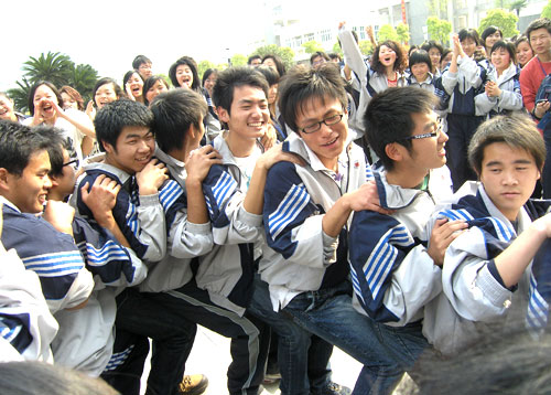 你看这边场地上人蛇钻洞的选手跌跌撞撞,动作笨拙依然锲而不舍,逗得观众笑个不停;场地中间的拔河比赛又激战正酣,队员们捋肘卷袖,扎起马步,个个面红耳赤,斗志高昂;最有趣的当属抬轿子比赛,被抬的人不能太重,抬的人重心要稳,而且步伐要整齐,节奏要一致,需要3个人的密切配合,然而“人仰马翻”的场景常常上演,令人捧腹。场上比赛紧张激烈而不乏乐趣,场下的观众虽未亲自上场,却也全神贯注,为选手鼓掌叫好。体育老师黄淼说:“在校园中,平时见多也玩惯篮球、足球、排球等竞技体育项目,现在大学生们玩这些传统民俗体育运动项目特别带劲。本次运动会也给予了每一名青年学生一次难得的机会来了解民间传统体育项目,也让学生在竞技体育外享受到了体育所带来的快乐。”一位大一女生说:“在校园里举办民俗体育运动会,这种形式很新颖,能让我们在紧张的学习状态中得到放松,在快乐中体会到大学生活的丰富多彩,第一次在校园看到了如此别开生面的体育盛会。”