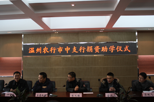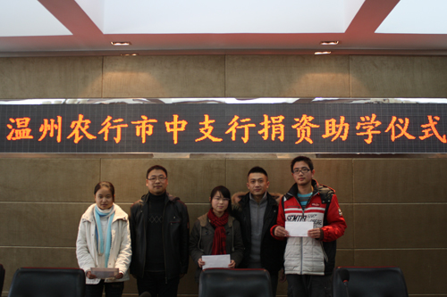 1月15日,温州市农业银行市中支行全体员工捐资6000元,结对资助财会系三位大学生。当天,结对仪式在行政楼301会议室举行,三位来自财会系08级、09级的贫困大学生每人收到2000元助学金。