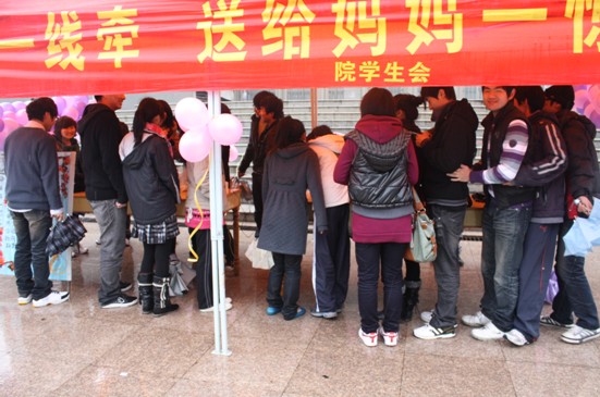 2010年3月8日,我院学生会举办的以“电话一线牵 送给妈妈节日惊喜”为主题的三八妇女节爱心活动在我院体育馆前拉开帷幕。此次活动是我院校园文化广场系列活动之一,由院学生会与中国移动公司合作,为我院广大学子提供免费同亲人通电话的机会,给含辛茹苦培育我们的母亲,带去最为诚挚的节日问候。