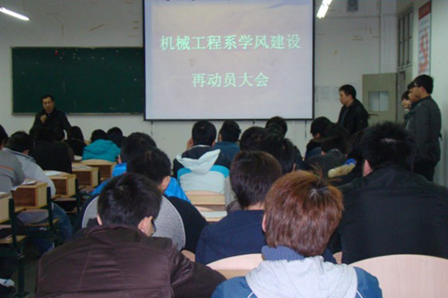 据悉,机械系为进一步推动学风建设,成立了系先进文化建设工作室,重视环境文化和网络文化的熏陶作用;制订了《关于学风建设的补充规定》,将对学生的思想教育融于“说学读唱经典”活动中,比如强制违纪学生通过背诵《道德经》来转变其内因;在组织上,从班主任、教工党员和系党政协同辅导员等三个层面对班级进行管理,还出台了班会报告及听班会课制度。