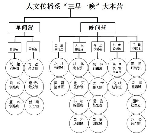 本学期,为丰富晚自修活动内容,拓展晚自修活动形式,人文传播系在晚自修营下设人文素养连、专业技能连、形象设计连、兴趣拓展连、自主学习连;在五个连的基础上下设英美电影鉴赏班、文字录入班、摄影基础班、视频剪辑班、书法绘画班、口才培训班、舞蹈训练班、社交礼仪班、以棋会友班等十六个相关项目班级。项目班级采取“学生自主展开、专长导师指导、专业老师授课”的方式开展各种活动,学生可以根据自己的兴趣爱好选择参与,来锻炼自己的专业能力,提高自己的综合素质。
