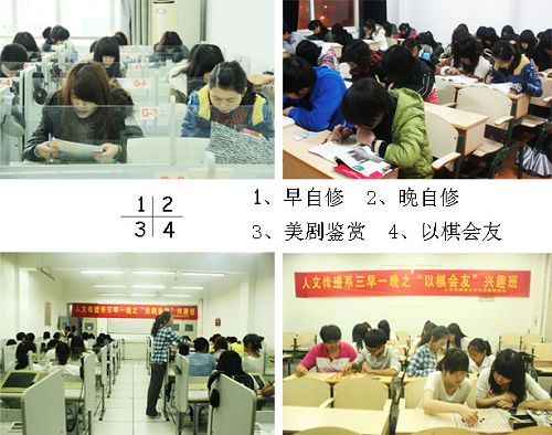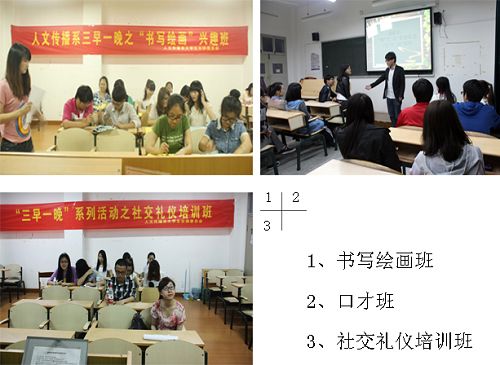 为了更好地体现“三早一晚”活动的“常态化、菜单化、专业性、结合性”,本学期,人文传播系打破 “三早一晚”活动传统的开展模式,按照“学生自主学习制、学长导师指导制、专业教师授课制”的新型思路来开展“三早一晚”活动,丰富了学生早晚活动的内容,提高了学生的综合素质。