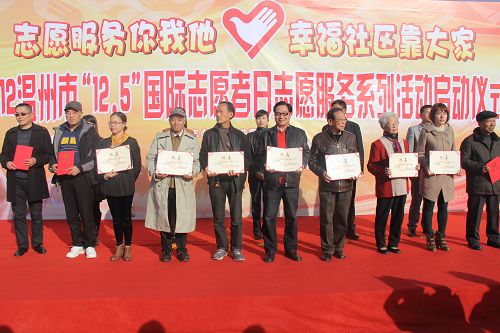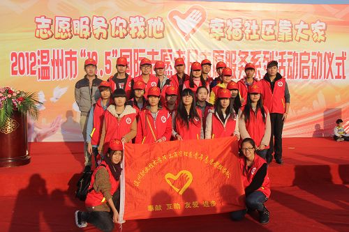 12月5日,共青团瓯海区委和梧田街社区委会在梧田社区举办了以“志愿服务你我他,幸福社区靠大家”为主题的2012温州市“12.5”国际志愿者日志愿服务系列活动启动仪式。团市委副书记黄少燕、团区委书记王芬、瓯海区副区长钱素文、武田街道副书记蔡向波及十多支志愿者队来席,我院工商系林景老师及社工部各成员也参加了此次启动仪式。