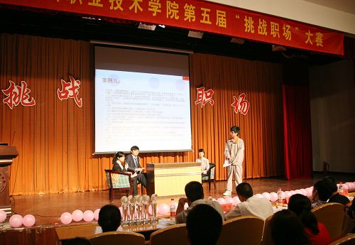 5月11日晚,温职院第五届“挑战职场”大赛在学术报告厅举行。本次大赛由院招生就业处主办,学院八大系16位选手参赛,最后由评委打分产生“十佳职场之星”。比赛邀请了永嘉奥康鞋业营销有限公司总经理郑余忠、温州尊龙汽车销售服务有限公司副总经理陈诚、温州索易软件开发有限公司人事经理陈丹丹、温州怡联网络科技有限公司人事主管徐文燕、温州海螺集团豪普森生物识别公司人力资源总监谢道光、申瓯通信设备有限公司人力资源部经理万谦勇担任评委。
