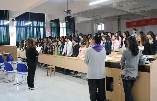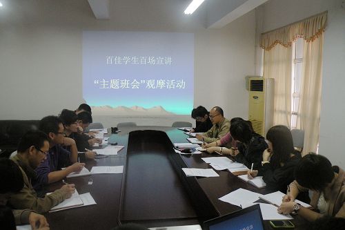 近日,由学院学工部、团委主办,财会系团总支承办的温州职业技术学院“百佳学生•百场宣讲”主题班会观摩活动在教学1号楼101教室举行。本次主题班会以“谢谢你的爱”为题,会计0904和会计1004两个班级以联谊的形式举行了公益爱心宣讲主题班会活动。财会系党总支书记叶吉波、院团委副书记吴冰、各系思政辅导员观摩了本次班会。观摩活动之后,学工部部长蔡后界组织辅导员对如何开好主题班会、推进学生思想教育展开了讨论。