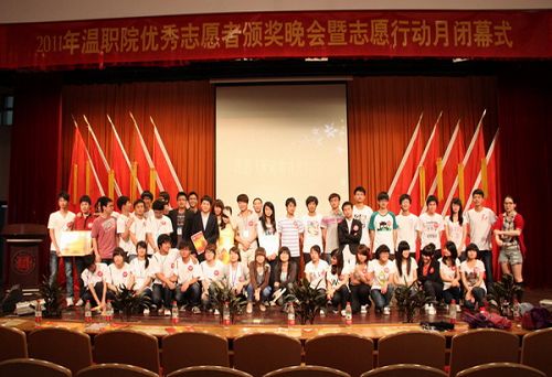 5月16日晚,温州职业技术学院2010/2011学年优秀志愿者表彰典礼暨2011年“志愿服务月”活动闭幕晚会在信息楼报告厅隆重举行。院团委副书记吴冰,各系思政辅导员和青年志愿者代表参加了本次活动。