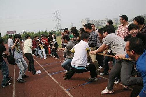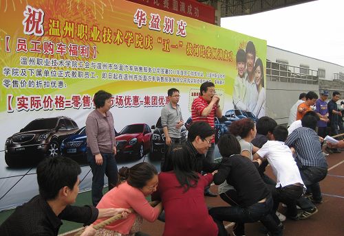 为丰富教职工课余生活,增强凝聚力,激发大家参与体育健身的积极性,4月27日下午,由学院工会组织的庆“五一”拔河比赛第一轮淘汰赛在学院田径运动场上如期举行,本次比赛得到了温州华盈别克公司的友情赞助。