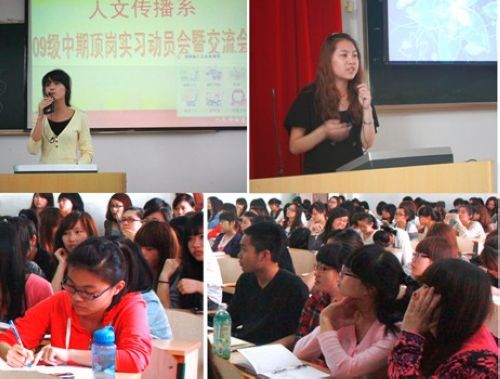 为了让09级学生积极地面对即将到来的顶岗实习,2011年4月27日下午人文传播系举办了一场别开生面的中期顶岗实习动员会暨交流会。