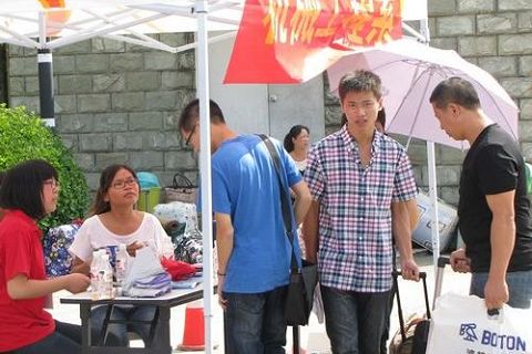 大门口志愿者们在认真接待新生