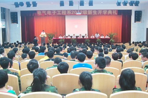 9月10日晚,电气电子工程系在学术报告厅隆重举行2012级新生开学典礼。典礼在庄严的国歌中拉开了序幕,主持人向到会的438名2012级新生介绍了在主席台就坐的系领导和老师,他们有系主任陈大路、系党总支书记晁拥军、系副主任苏绍兴、五个专业的教研室主任和各职能科室的负责人,与会教师齐整的服装和饱满的精神充分体现了电气系教师团队高品质的职业素养,给全体新生留下了深刻的印象。