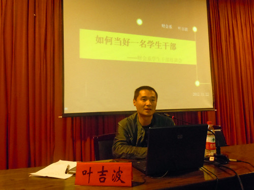 而后,叶书记针对“如何当好一名学生干部”一问题作出了讲解:作为一名学生干部,不应该仅仅只是为了培养自己的能力而承担起这份责任,更多的是应该为服务于同学,服务于他人;并在工作上以身作则,注意形象,树立威信;在管理方面要学会正副分工,分层管理,少一些功利心,将干部工作当成是自己的事情来做。最后,他希望各个学生干部明白自身在整个学生团体中所应当扮演的角色,明确自己所应承担的相应责任,在日后的活动中“当好一名学生干部”。