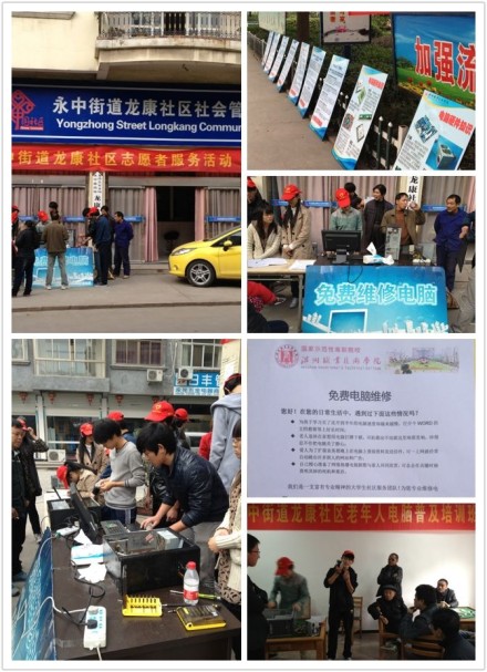 为了提高计算机系学生电脑维修的技能,调动学生为社区、 为社会服务的精神和热情,11月24日,系社工部15名志愿者前往龙康社区进行电脑免费维修,服务老人活动。