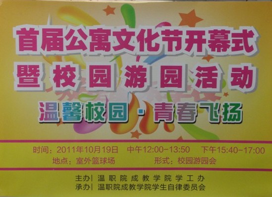 近日,成教学院在教学楼前和篮球场举行了首届公寓文化节开幕式暨校园游园活动。繁荣公寓文化,丰富课余生活,加强学生公寓文化建设,促进学生之间交流合作,打造温馨公寓,构建和谐校园环境,是举办此次公寓文化节的目的所在。学生们开始把与生活最密切的公寓作为传播先进文化的“主战场”。