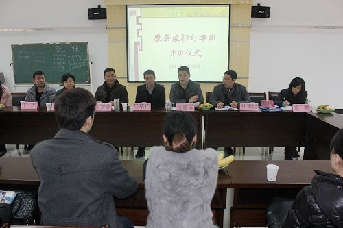 1月10日中午,我院首期康奈虚拟订单班开班仪式在招聘大厅隆重举行。康奈集团人力资源部经理任培广、人力资源部刘颖助理、张利民助理,学院招生就业处处长谷智静、副处长金建孟、工商系林香港老师、人文系余爽老师以及人文、工商、电气等全体订单班学员一起出席了开班仪式。开班仪式由金建孟老师主持。