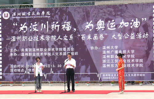 为表达温州大学生对奥运的支持和对汶川特大地震的关切,5月25日下午1:30,共青团温州职业技术学院委员会主办、温州职业技术学院人文系承办、温州各大高校协办的“为汶川祈福,为奥运加油”为主题的红五月“百米画卷”大型公益活动隆重举行。温州美术家协会理事李久平先生、温州鹿城区美术家协会秘书长俞坚平先生特来为此次活动助阵,温州职业技术学院人文系张小加书记为本次活动作了精彩致辞。