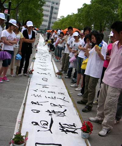 汶川特大地震一直牵动着温州学子的心,温州各大高校的学生代表一起绘制了长达100米画卷,美术家李久平先生、俞坚平先生在“百米画卷”上题词并参与绘画。同学们在百米画卷上或是绘画,或是书写,一些同学还别出心裁地用折好的千只纸鹤拼成巨大的爱心形状,用千纸鹤汇聚成千颗爱心,为地震中遇难的同胞捎去深深的悼念。同时,为迎接即将到来的北京奥运会,同学们聚精会神的在百米画卷上绘制了色彩斑斓的水彩画、憨厚可人的福娃,书写了行云流水的祝福寄语,无不渲染着他们对2008北京奥运会的诚挚祝福。