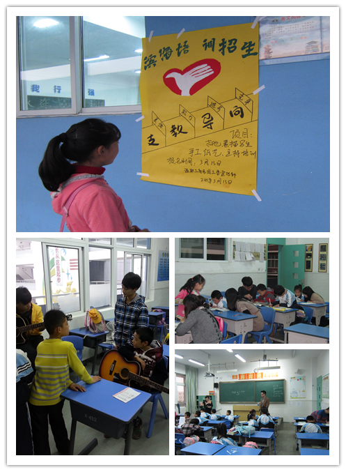 经系部统一选拔面试、试讲、备课,在100余名报名的志愿者中,筛选出了20名优秀学生讲师。本批新增的学生讲师将以“传帮带”的方式接受集中备课、统一试讲等前期培训。讲师团学生定期在每周五下午到滨海学校开展手工、吉他、主持人、素描等特色专项培训班。本学期应学校要求,还开展了“四点半学校”,定期按不同年级分班开展课程辅导。讲师们用自己的爱心和才能去关爱民工子弟的孩子,给孩子们带去欢乐和知识,将爱播撒滨海。