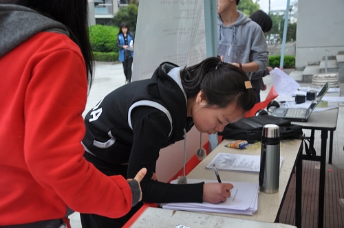 活动现场人头攒动,报名点里循环播放的《温职新闻》视频,大学生通讯社学生工作人员热情的现场宣传,吸引了许多同学驻足报名,他们聚拢到展台前询问活动详细情况,并填写报名表,从他们跃跃欲试的表情中可以看出他们对这次活动充满着期待。前来咨询报名的同学表示,他们是通过微博、海报、传单、同学朋友等多种途径了解到这个招募活动,希望以此来更好地表现和锻炼自我。