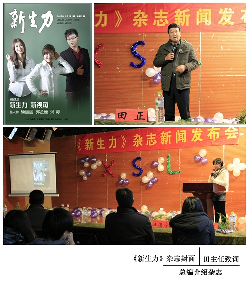 为了丰富校园生活,发扬校园文化,《新生力》杂志社于2012年10月正式成立,其秉承着“弘扬人文精神,发掘新生力量”的宗旨,为广大学生呈上一个展现自我特长的舞台。在2013年新年之际,温职院唯一一档以电子杂志形式供广大读者品阅的刊物——《新生力》全新改版正式与广大师生见面并举办了杂志的新闻发布会,同时也赢得了人文传播系各领导及学生的热捧。