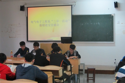 为了进一步做好我系“二早一活动”,加强对学生管理队伍的培训,完善管理工作的制度,积极发挥学生在管理工作中的自我教育和自我管理作用,电气电子工程系自律委员会邀请学院自律委员会主席、工商系自律副主席来我系就“二早一活动”传经送宝,系自律委员会全体成员,班级管理干部参加了本次交流会。