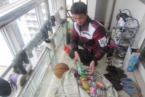 入党积极分子在整理废弃的塑料瓶