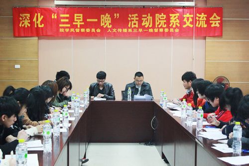 为了扎实做好深化“三早一晚”工作,3月19日,人文传播系在实训一号楼一楼会议室组织召开了院系分管“三早一晚”工作学生组织交流会。