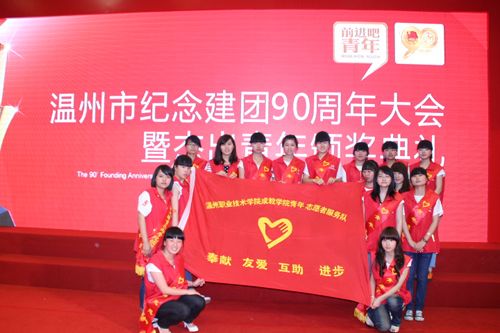 5月4日,温州市纪念建团90周年暨杰出青年颁奖典礼在人民大会堂隆重举行,我院成教学院的青年志愿者为本次大会提供引导、迎宾、签到等志愿者服务工作。