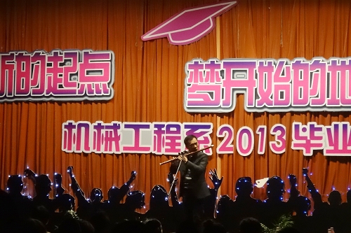随后,精彩的表演正式开始。有毕业生王杭杭等同学表演的《新白蛇传》,他们诙谐幽默的语言以及惟妙惟肖的模仿获得全场阵阵掌声和欢笑。胡新老师用一首歌曲《用心良苦》向同学们诉说和传递了老师的“用心良苦”和美好祝愿。紧接着大一同学用他们自己独有的方式在小品、舞蹈、歌曲和音乐剧中表达了对学哥学姐们的祝福。最后黄加銮老师为毕业生们送上的笛子演奏《送别》将晚会推向了高潮,一人吹奏,众人和唱,场面令人动容。