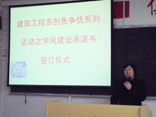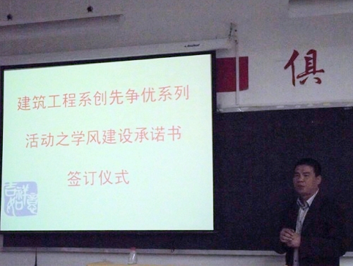 2010年11月15日中午,建工系创先争优系列活动之学风建设承诺书签订仪式在建工实训楼505举行。建工系书记李达聪、副主任黄淑森出席仪式,大一、大二各班班干部集体参加了此次签订仪式,仪式由辅导员包邦胜主持。