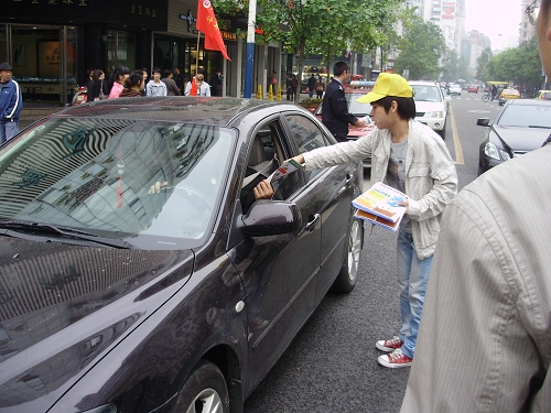 本次宣传活动得到了温州市五马街交警的大力支持,六名公安民警也参与到活动中。虽然天下着小雨,但服务队的每个人都手拿宣传单,悉心为每个过往停留的车辆发放“交通事故处理方式和步骤”宣传单。除此之外,队员们更是详细地为司机讲解了一些交通事故快速处理的方式。