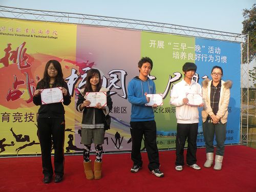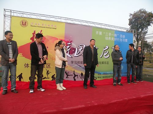 为更好地推进“三早一晚”活动,丰富学生校园文化生活,切实推进学风建设,促进学生身心健康和谐发展,弘扬积极进取、顽强拼搏的精神,2010年12月6日7时许,由共青团温州职业技术学院委员会、公共教学部主办,院学生会与各系团学组织承办的2010年“校园吉尼斯” (体育竞技区)启动仪式在操场健身区举行。学工部部长、学生处处长蔡后界,公共教学部主任、党总书记赵岳峰出席并致辞。参加启动仪式的还有院团委副书记吴冰及各系辅导员代表。