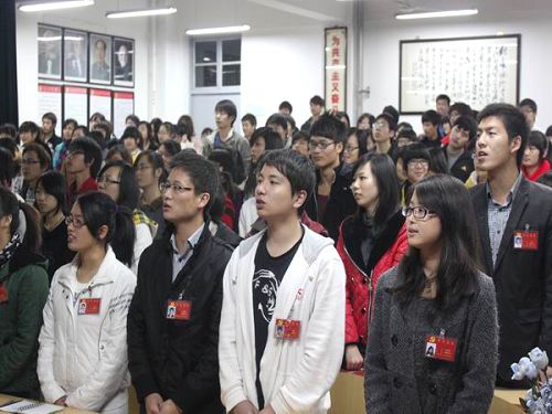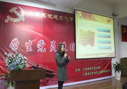 为纪念12.9运动75周年,活动现场还进行了“学生党员进班级讲党课”活动。学生党员讲师俞锦绣同学为党校学员做了一堂内容丰富的“纪念12.9运动75周年主题党课”。 党课在由入党积极分子组成的工商系红歌团一曲嘹亮的《闪闪的红星》齐唱声中拉开序幕。党校组长代表为在场学生做时事要闻通报。随后,学生党员俞锦绣同学开始了“纪念12.9运动75周年主题党课”的授课。课内还进行了一二•九运动知识问答活动,十名学生党员现场以集体朗诵诗歌《青春中国》的形式号召同学们铭记历史,继承传统,发扬爱国主义精神。