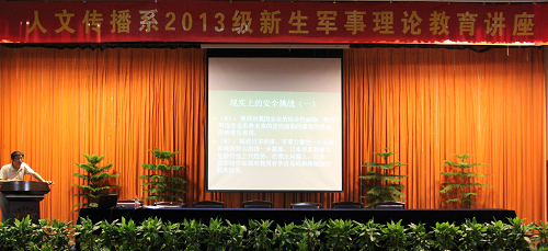 10月15日晚6点30分 人文传播系举办了2013级新生军事理论讲座。本次讲座有幸邀请到纪委书记何忠老师为大一新生传授国防知识。