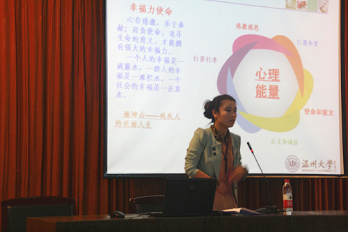 为引导财会系2013级新生正确认识新环境中遇到的问题,学会自我调适,顺利融入大学生活,用积极的心理去感知幸福。10月16日晚18时,书香财会心理讲堂在树人堂顺利举行。此次讲座的主题为“积极心理学感召下的幸福力——新生心理适应性专题讲座”,主讲嘉宾为来自温州大学的国家二级咨询师靳颖老师。讲座由系学工办主任马德龙主持,近500名新生聆听了本次讲座。