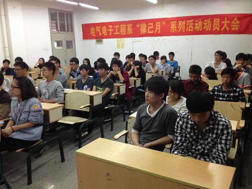 为进一步加强校园的文明建设,提高同学们的自律意识,构建文明和谐的校园环境,电气系于10月16日周三下午召开了电气电子工程系“律己月”系列活动动员大会,并邀请系辅导员陈丹老师、团总支书记刘彬桦、系学生会主席汪春光出席了此次动员大会。