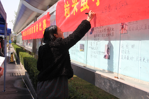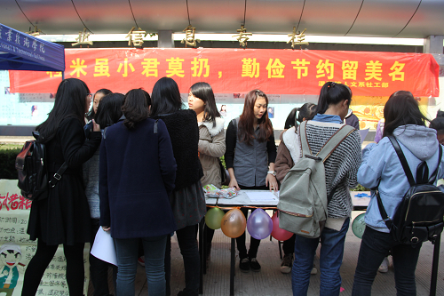 近日,为了号召全体师生珍惜每一粒米,珍惜每一份菜。人文传播系社工部在第一餐厅门口开展了以“粒米虽小君莫扔,勤俭节约留美名”为主题的感恩粮食的活动。