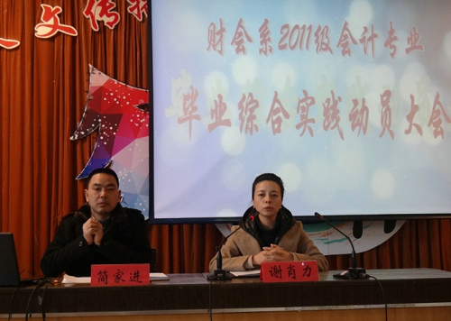 12月20日,财会系在明德楼学术报告厅召开“财会系2011级会计专业毕业综合实践动员大会”,这是继12月18日金融专业学生毕业综合实践动员大会后的又一次会议。系党总支书记谢肖力、副主任简家进及相关老师出席了会议。
