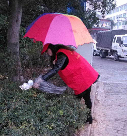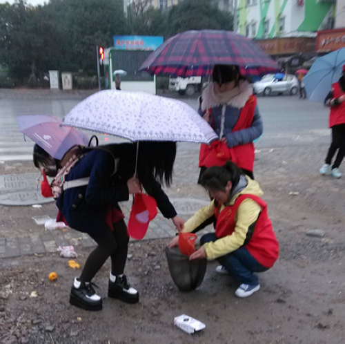 环卫先锋志愿活动是财会系“关爱环卫工人”志愿活动的重要组成部分,旨在协助茶山环卫工人开展街道清扫工作,减轻他们的负担,促进清洁茶山的建设。由于天气问题,志愿者将街道清扫工作改成垃圾清除活动。毛毛细雨为志愿活动带来了诸多不便,但丝毫没有影响大家的公益热情。志愿者一手撑着伞,一手捡拾垃圾;大家分工合作,一部分在左,一部分在右;草坪、街道小巷、停车场,都留下了她们劳动的身影。经过近一个小时的努力,整个街道焕然一新。衣服脏了,但街道净了;身体累了,但心里美了。