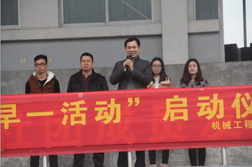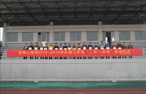 时间去哪了?一起来吧,让我们去参加“二早一” !晨风拂面,催人奋进,2月28日早7点,机械系在操场隆重举行2013/2014学年第二学期“二早一活动”启动仪式。系党总支书记黄加銮老师、学工办主任梅碎彬老师、陈德勇老师、沈蝶老师、陈金菊老师出席了仪式,全系同学精神抖擞地参加了活动。仪式由李晓蕾同学主持。