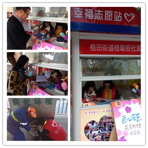 梧埏街社区是工商系2012年建立的校外志愿服务基地,与工商系保持长期志愿服务工作。今年,本梧埏街社区“幸福志愿站”将成为工商系党员先锋服务队又一服务阵地。志愿站以惠民便民服务为中心,定期开展“微笑换零”、“匠心花艺义卖”、手工花艺教授、自行车免费打气、免费充电等服务活动。