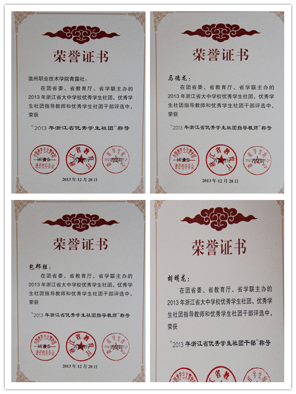 日前,团省委、教育厅、省学联联合下发《关于表彰2013 年浙江省大中学校优秀学生社团、优秀学生社团指导教师和优秀学生社团干部的决定》,我院青露社、绿色环保协会等2家社团获得“2013年浙江省优秀学生社团”称号,马德龙、包邦胜等2位教师获得“2013 年浙江省优秀学生社团指导教师”称号,胡明龙、顾雪峰、张灿等3位同学“2013 年浙江省优秀学生社团干部”称号。