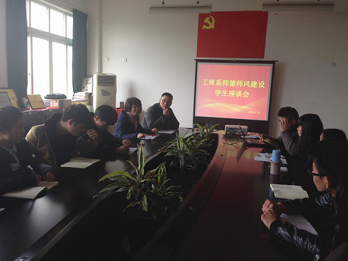 为全面、深入、务实地开展党的群众路线教育实践活动,为使系部师德师风工作落到实处,营造良好的育人环境。3月12日,工商系在208会议室召开了师德师风建设学生代表座谈会。系部各学生组织干部、各年级各班学生代表20余人参加本次座谈会。系党总支书记李建中老师、系副主任何海怀老师出席会议,并听取了学生代表的发言。此次座谈会旨在请学生帮助找出存在问题和不足,提出自己的意见和建议。