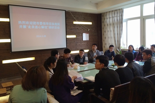 3月28日上午,温州团市委副书记沈醒一行来我院开展“走亲连心解忧”调研活动,在学生处处长叶吉波、建工系党总支书记苏跃飞,院团委副书记刘海明的陪同下,并就党的群众路线教育实践活动、青年学生成长成才和学少线工作情况征询我院团员青年和基层团干的意见及建议。
