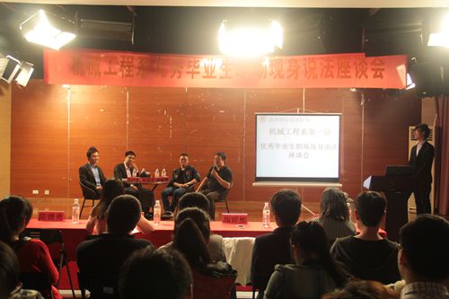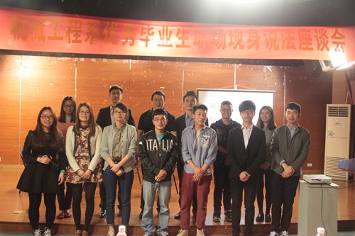 座谈会上,三位学长都热情地与同学们分享他们的大学生活及工作历程。从当初的篮球队队长到现在的销售公司总经理,林祖表学长向我们证明了学机械的理工男照样可以能说会道;现在在哈雷戴维森工作的黄珂莹学长,他用幽默的语句以及真实的生活事例来激励我们;去年刚毕业、现在已经做到副总助理的蒋贤豪学长,则用最朴实的话语和实际行动来告诉我们,只有从基层干起,才能勇攀高峰!